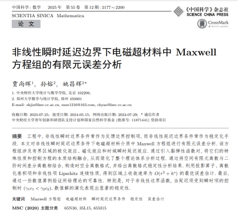 成果速递第14期:非线性瞬时延迟边界下电磁超材料中Maxwell方程组的有限元误差分析