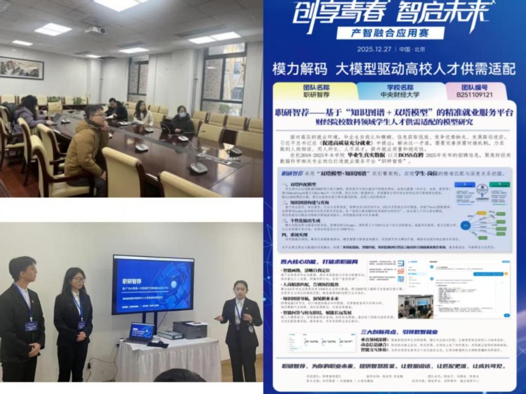 近日,在首届北京市大学生“人工智能+”创新大赛中,我院“职研智荐”团队凭借扎实的技术实力与精准的场景应用,荣获一等奖。